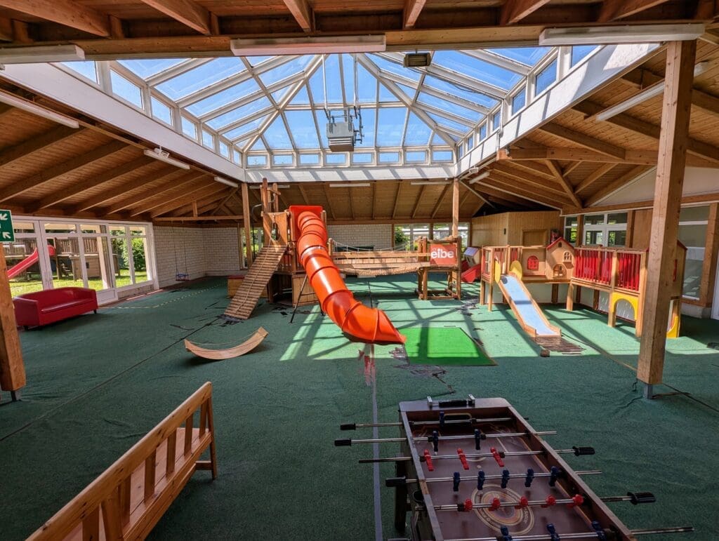 Die beiden jüngsten Gruppen sind im sogenannten Kinderclub untergebracht – einem geschützten, räumlich abgetrennten Bereich direkt am Klinikhauptgebäude. Von hier aus haben die Kinder auch Zugang zum beliebten Spielhaus, einem großzügig verglasten Indoor-Spielplatz, der wetterunabhängig zum freien Spiel einlädt.